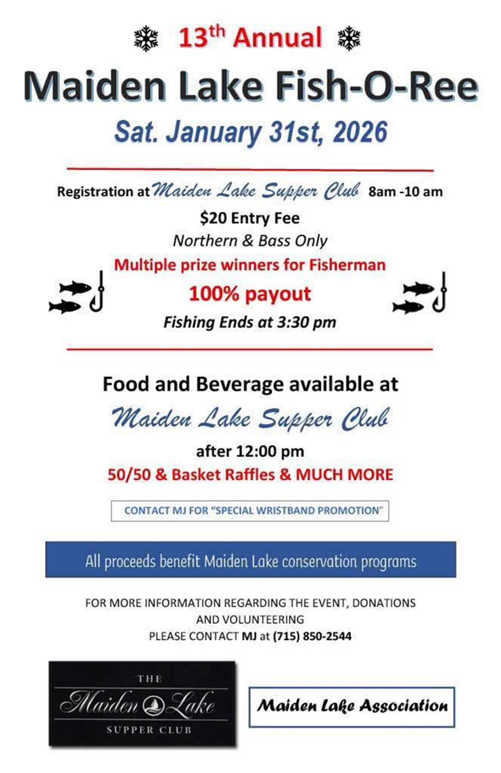 The 13th Annual Maiden Lake Fish-O-Ree will take place on Saturday, January 31, 2026. Entry fee is $20.00 and registration will be held at the Maiden Lake Supper Club from 8:00 – 10:00 am. Only Northern and Bass will count. There will be multiple prizes available with 100% payout. Fishing ends at 3:30 pm. Food and beverages will be available at Maiden Lake Supper Club after 12:00 noon. Enjoy 50/50 raffles and more. All proceeds will benefit the Maiden Lake conservation programs. For more information, donations or volunteer opportunities, contact MJ at 715-850-2544.