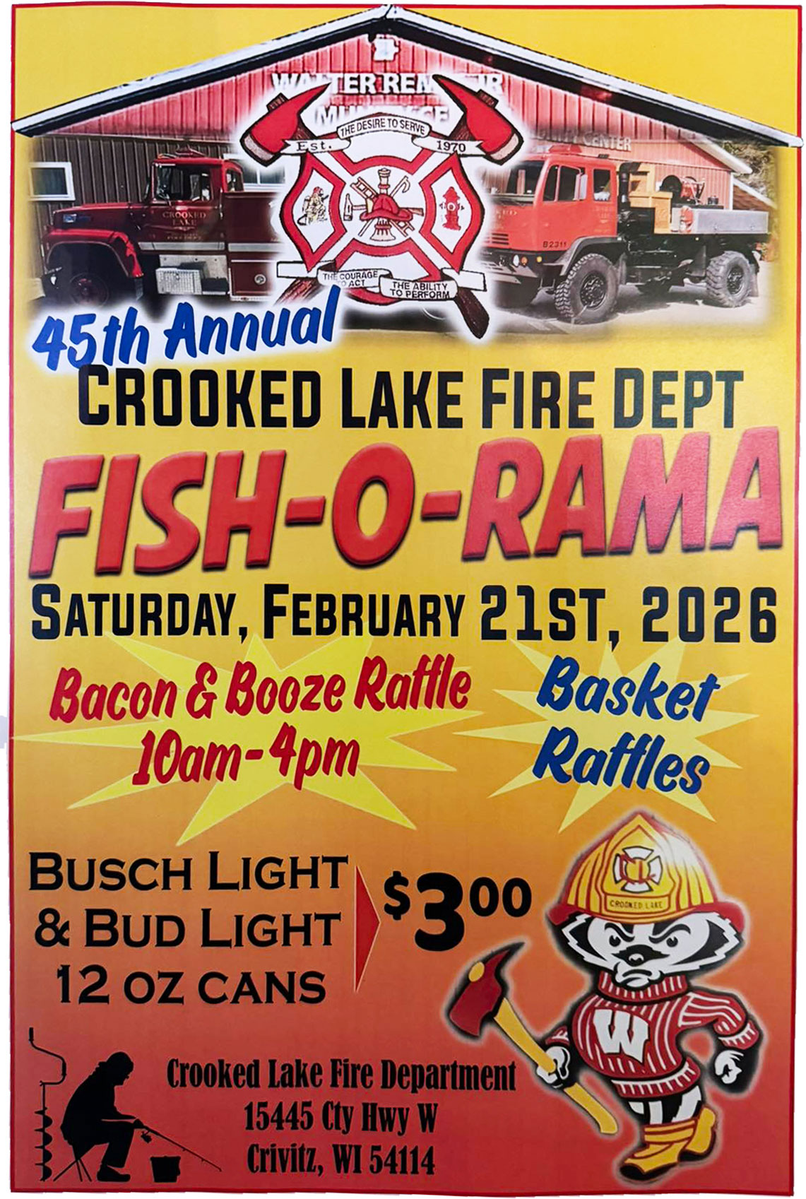 The 45th Annual Crooked Lake Volunteer Fire Department Fish-O-Rama will be held on February 21, 2026. Enjoy great burgers, brats and some of the best booyah around. For added convenience and make it more family friendly they are going to move the bacon and booze raffle, which will take place from 10:00 am – 4:00 pm, over to their apparatus bay where they park the firetrucks. This will make room in the community center to add tables for relaxing while eating along with making more room for the basket raffle.
