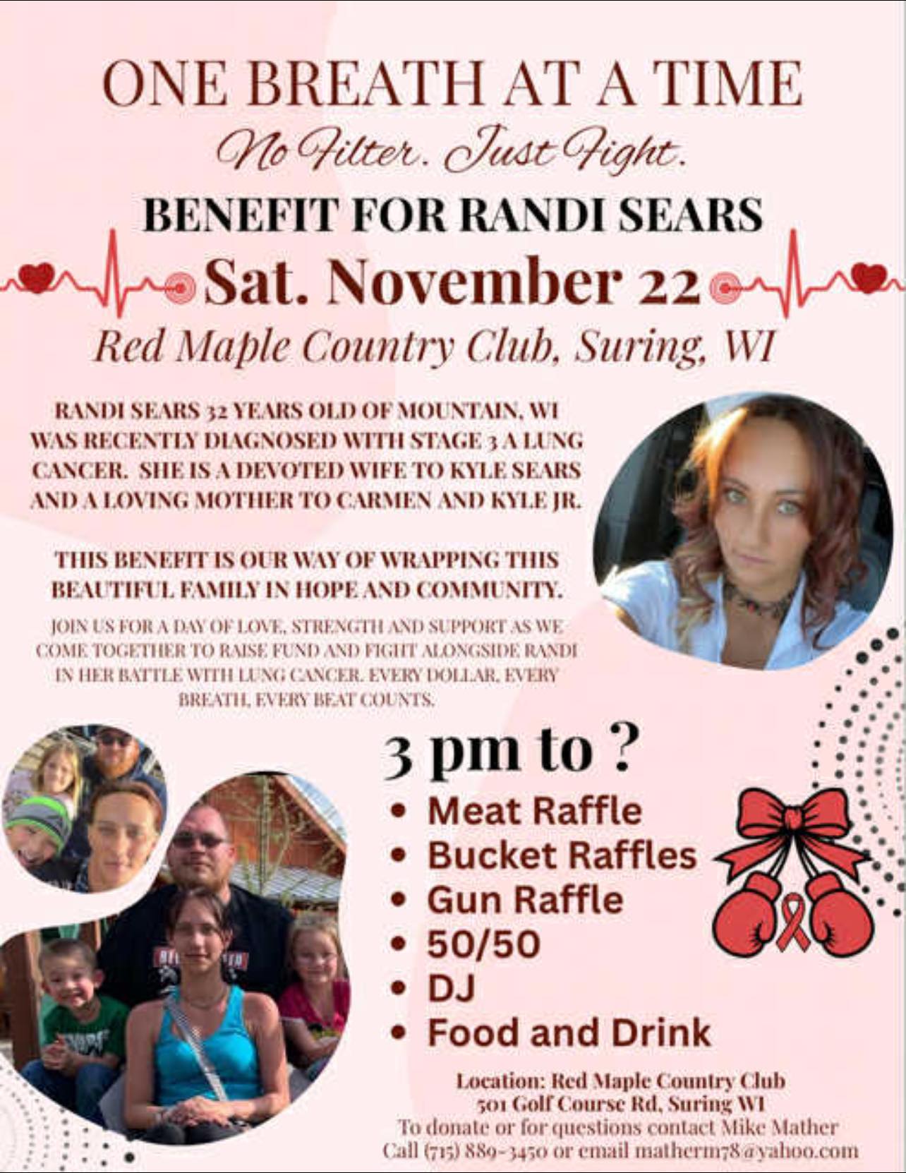 A benefit for 32-year-old Randi Sears, recently diagnosed with stage 3 lung cancer, will be held Saturday, November 22 at 3:00 pm at Red Maple Country Club, 501 Golf Course Road, Suring, WI. Events include meat, bucket, gun, and 50/50 raffles, plus a DJ, food, and drinks. For donations or more info, contact Mike Mather at 715-889-3450 or matherm78@yahoo.com.