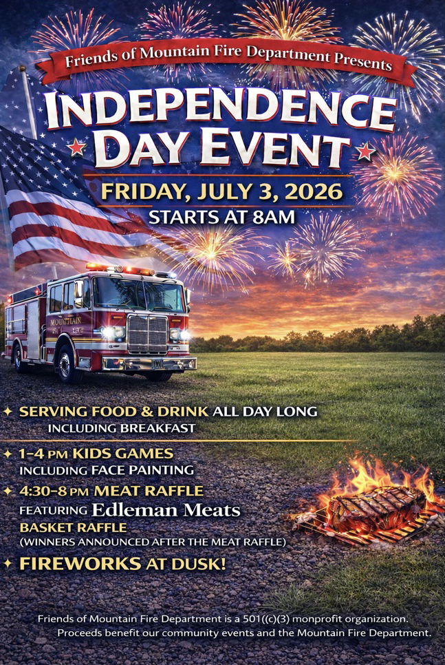 Join Friends of Mountain Fire Department for an Independence Day Event of summer fun on Friday, July 3, 2026. Food, drinks, kids games, face painting, meat raffles, basket raffles and fireworks. Starts at 8:00 am with breakfast, kids games from 1:00-4:00 pm, meat raffles with meats from Edleman Meats from 4:30-8:00 pm and fireworks at dusk.