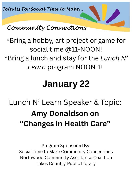 The January 22, 2026 Lunch ‘N Learn topic is “Changes in Health Care” presented by Amy Donaldson. Bring a hobby, art project or game for social time from 11:00 am – noon. Bring a lunch and stay for Lunch ‘N Learn program from noon to 1:00 pm. Program is sponsored by Social Time to Make Community Connections, Northwoods Community Assistance Coalition and Lakes Country Library.