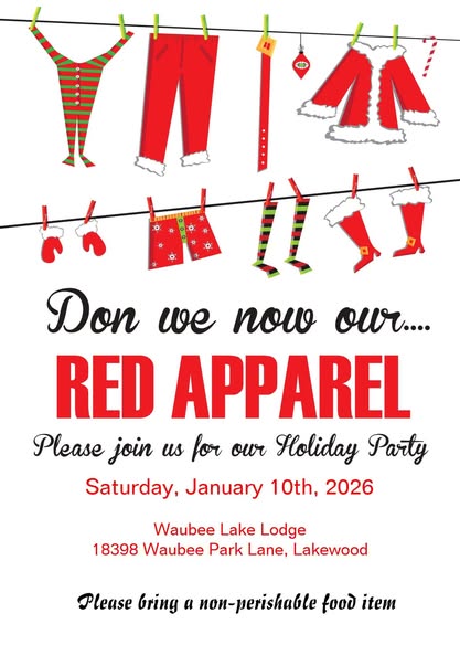The Red Arrow Snowmobile ATV Club Holiday Party is set for Saturday, January 10, 2026, at Waubee Lake Lodge. All current and prospective members are invited. Registration opens soon; updates will follow. The event begins with registration and cocktails at 5:00 p.m. (each paid guest receives two drink tickets), a club update at 5:30 p.m., buffet dinner at 6:00 p.m. featuring tenderloin tips, broasted chicken, sides, and dessert, followed by games at 7:00 p.m. Cost: $25.00 for ages 18 and over, $21.00 for ages 3–17, free for children under 2. Waubee Lake Lodge is located at 18398 Waubee Park Lane in Lakewood.