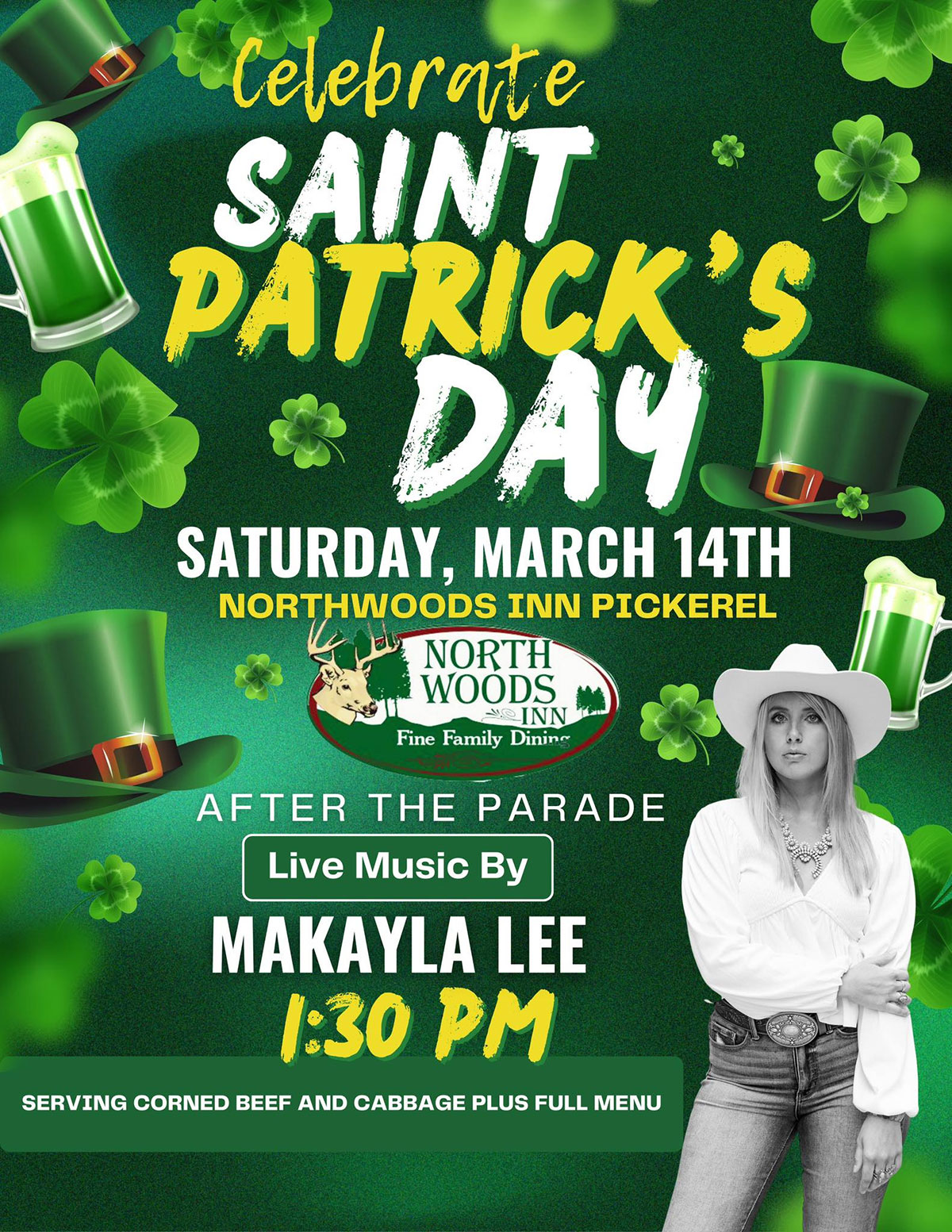 Experience the excitement of St. Patrick’s Day at Northwoods Inn, where the festivities continue after the 35th Annual St. Patrick’s Day Parade on Saturday, March 14, 2026. Beginning at 1:30 pm, enjoy a live musical performance by Makayla Lee. Known for her remarkable voice and engaging stage presence, Makayla consistently captivates her audience—her performances are a favorite among Northwoods Inn customers.