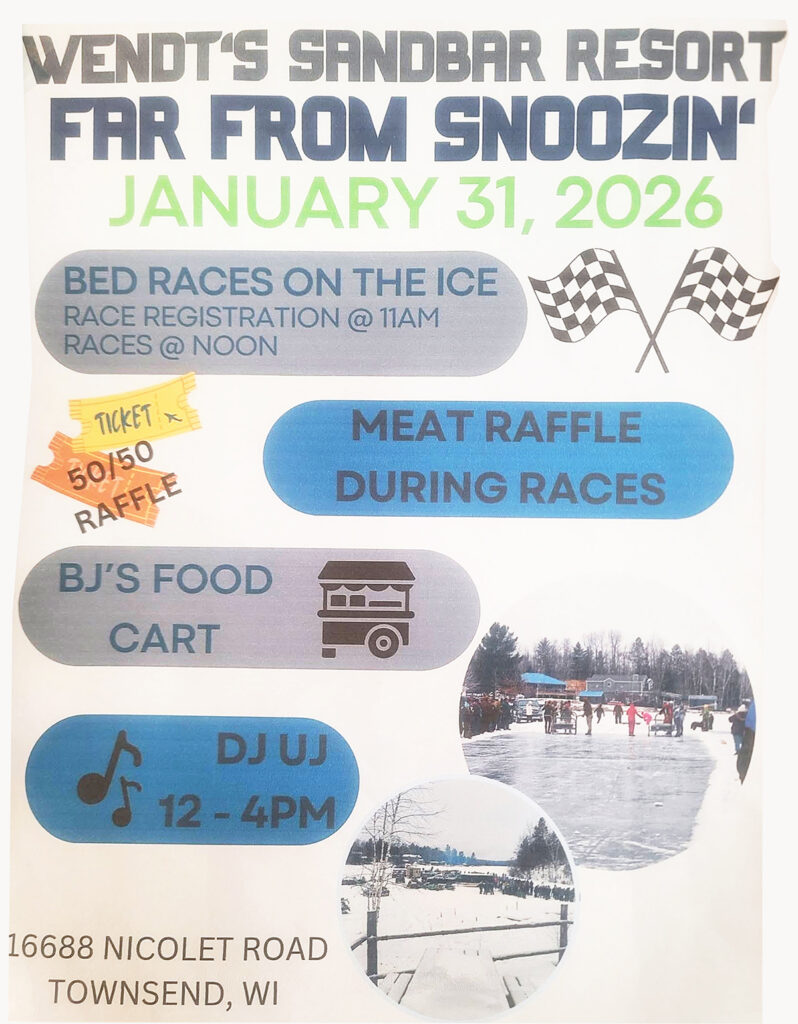 Check out Wendt’s Sandbar Resort’s Far From Snoozin’ on Saturday, January 31, 2026. The day will start out with bed races on the ice. Registration will start at 11:00 am with the races at 12:00 noon. There will be meat raffles during the races and a 50/50 raffle. BJ’s Food Cart will be on hand. Entertainment will be provided by UJ the DJ from 12:00 noon to 4:00 pm.