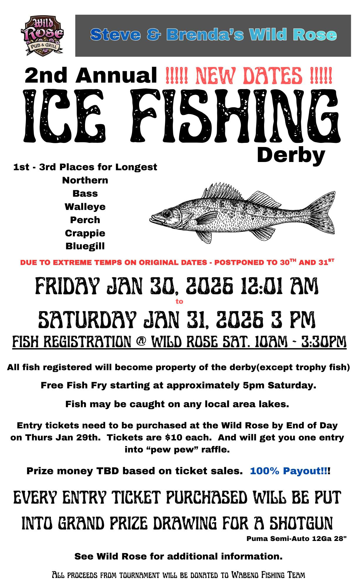 Steve & Brenda’s Wild Rose Pub & Grill’s 2nd Annual Ice Fishing Derby will be held on Friday, January 30 to Saturday, January 31, 2026 at 3:oo pm.