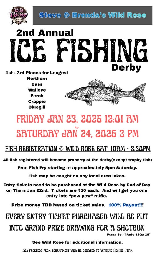 Steve & Brenda’s Wild Rose Pub & Grill’s 2nd Annual Ice Fishing Derby will be held on Friday, January 23 to Saturday, January 24, 2026 at 3:oo pm.