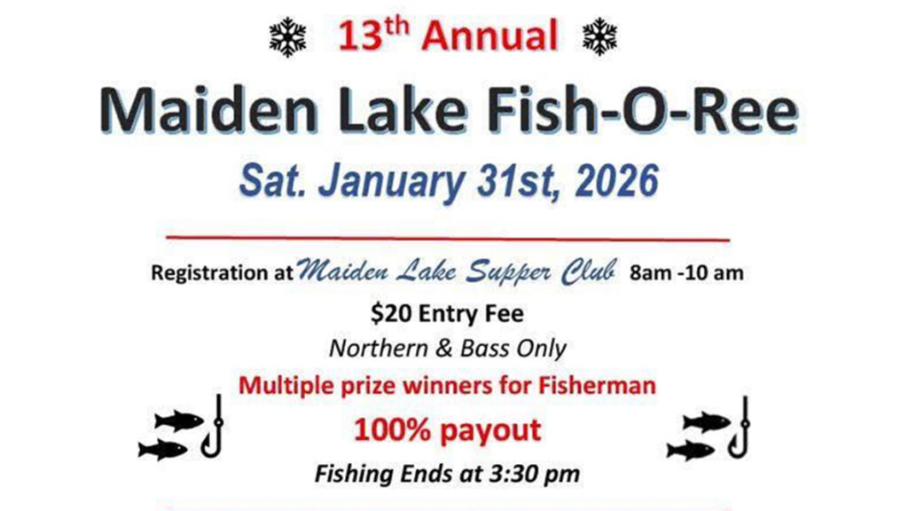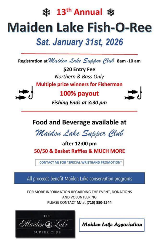 The 13th Annual Maiden Lake Fish-O-Ree will take place on Saturday, January 31, 2026. Entry fee is $20.00 and registration will be held at the Maiden Lake Supper Club from 8:00 – 10:00 am. Only Northern and Bass will count. There will be multiple prizes available with 100% payout. Fishing ends at 3:30 pm. Food and beverages will be available at Maiden Lake Supper Club after 12:00 noon. Enjoy 50/50 raffles and more. All proceeds will benefit the Maiden Lake conservation programs. For more information, donations or volunteer opportunities, contact MJ at 715-850-2544. Maiden Lake Supper Club is located at 15645 Maiden Lake Rd in Mountain. Follow this link for more information.