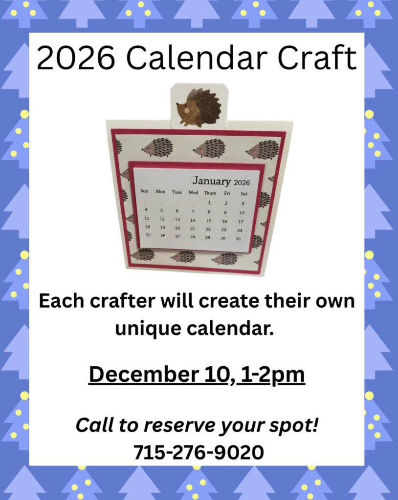 You will be able to highlight your creativity at the Lakes Country Public Library on December 10, 2025 at their 2026 Calendar Craft event. Each crafter will create their own unique 2026 calendar. The event will take place for 1:00 – 2:00 p.m. To save your spot at this event, please call 715-276-9020. The Lakes Country Public Library is located at 15235 State Hwy 32 in Lakewood.