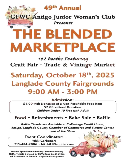 The 49th Annual CFWC Antigo Junior Woman’s presents The Blended Marketplace that will feature 142 booths of crafters and trade and vintage marketplace on Saturday October 18, 2025 at the Langlade County Fairgrounds from 9:00 a.m. to 3:00 p.m. There will be food, refreshments and a bake sale. Admission is $1.00 with the donation of a non-perishable food item and $2.00 without a donation. Children under 10 are free with an adult. Raffle tickets are available at CoVantage Credit Union, Antigo/Langlade Chamber of Commerce and Visitors Center and at the event day of the show. All proceeds benefit the Langlade County area. See event page for more details.
