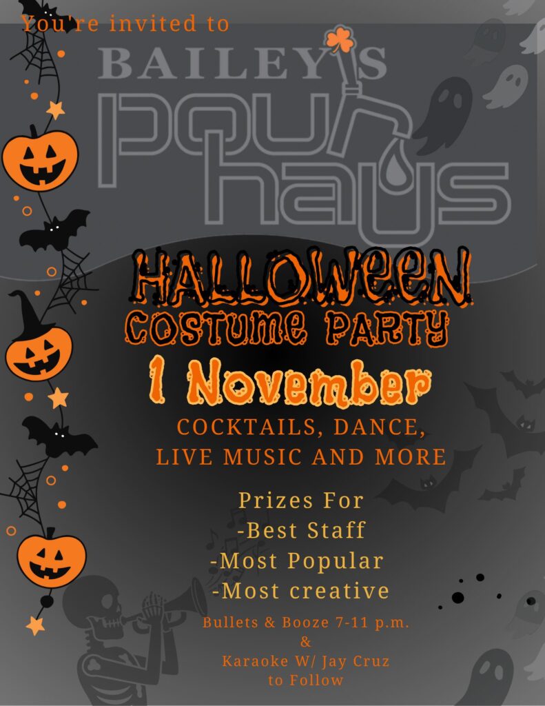 Bailey’s Pour House in Lakewood will host a Halloween Costume Party on November 1, 2025, with cocktails, dancing, live music, and prizes for Best Staff, Most Popular, and Most Creative. Bullets & Booze performs 7–11 p.m., followed by Karaoke with Jay Cruz. See event page for more details.