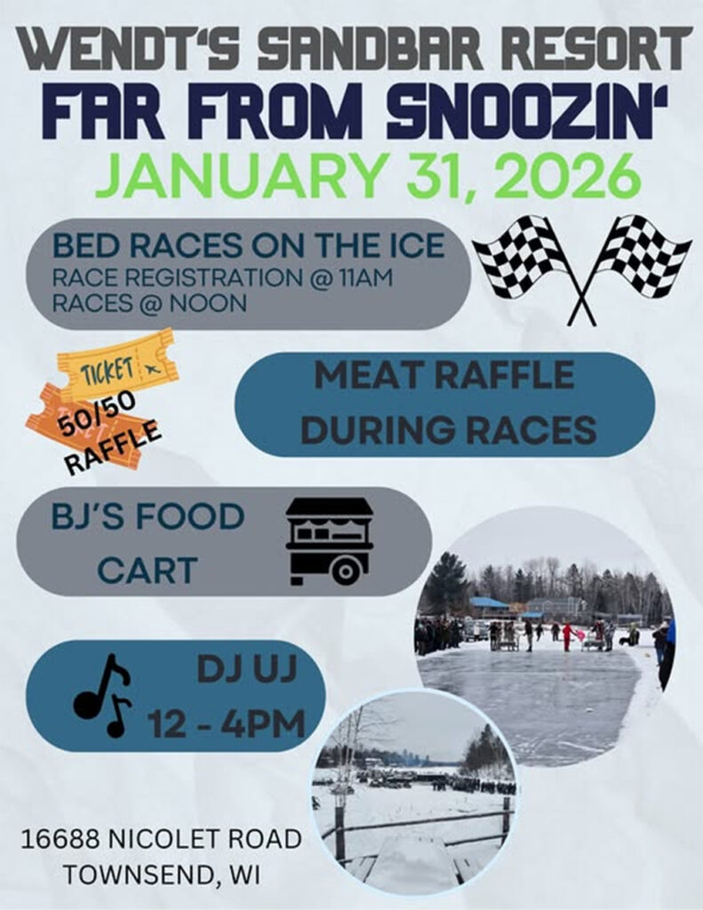 Check out Wendt’s Sandbar Resort’s – Far From Snoozin’ – on Saturday, January 31, 2026. The day will start out with bed races on the ice. Registration will start at 11:00 am with the races at 12:00 noon. There will be meat raffles during the races and a 50/50 raffle. BJ’s Food Cart will be on hand. Entertainment will be provided by UJ the DJ from 12:00 noon to 4:00 pm. Wendt’s Sandbar Resort is located at 16688 Nicolet Rd in Townsend. Follow this link for more details.