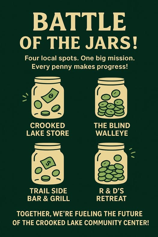 The Crooked Lake Community Center Renovation Project has now raised $80,000. Penny War round 2 is underway until Thursday, November 6, 2025. Every penny, bill, or silver coin donated helps keep the excitement alive and supports the Renewing Together, Creating a Place for All campaign. All contributions go directly to the renovation fund, making an impact one coin at a time.