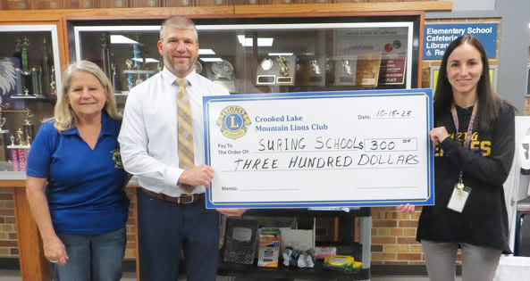 The Crooked Lake/Mountain Lions Club collected school supplies for the Suring School District. This year, they decided to make a monetary donation along with the collection of school supplies that they collected from their members. Crooked Lake/Mountain Lions Club member Susie Zeyen is pictured here presenting a $300 donation to Superintendent Robert Caelwaerts of the Suring School District and Social Worker Megan Keplinger.
