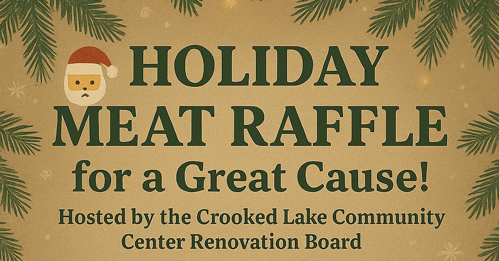 The Crooked Lake Community Center Renovation Board will be hosting a Holiday Meat Raffle on Saturday, December 20, 2025 starting at 1:00 p.m. at R& D’s Retreat located at 15345 County Hwy W in Crivitz. Join them for an afternoon of fun, prizes, and community spirit – all to support the Crooked Lake Community Center Renovation Project. Win delicious boxed meat from Pelkin’s Meat Market.