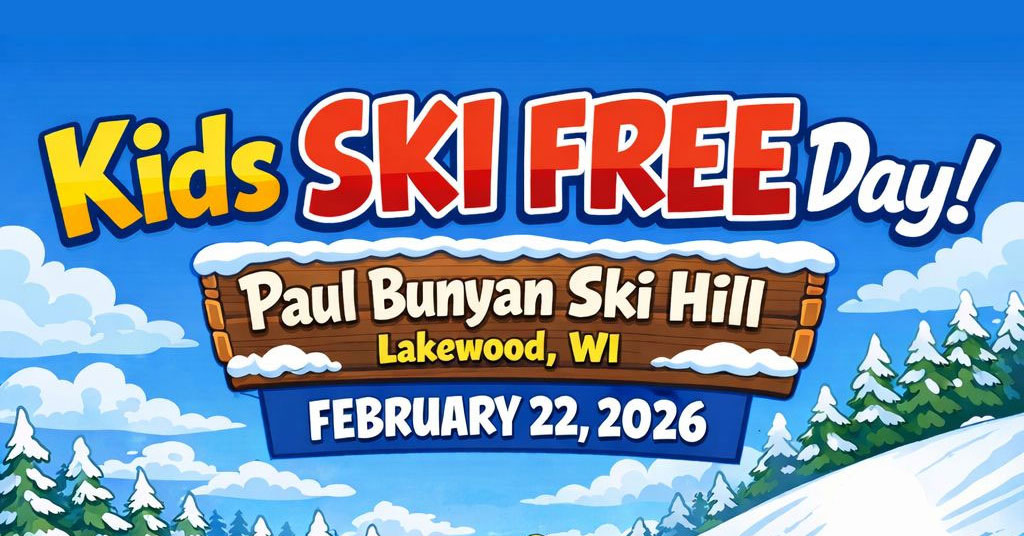 Kids ski free at Paul Bunyan Ski Hill in Lakewood on Sunday, February 22, 2026. This is for the first 50 kids and one must pre-register by calling 715-850-1129. This includes full rental equipment and a lift ticket for the day. Come on out for a family fun day and learn to ski.