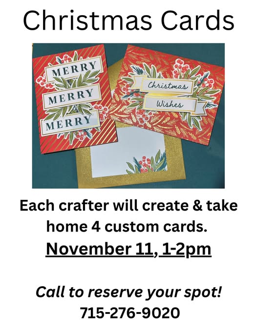 The Lakes County Public Library is hosting a crafters’ event on Tuesday, November 11, 2025, from 1:00 p.m. to 2:00 p.m., where participants can create and take home their own handmade Christmas cards. To reserve your spot, please call 715-276-9020. The Lakes County Public Library is located at 15235 State Hwy 32 in Lakewood.
