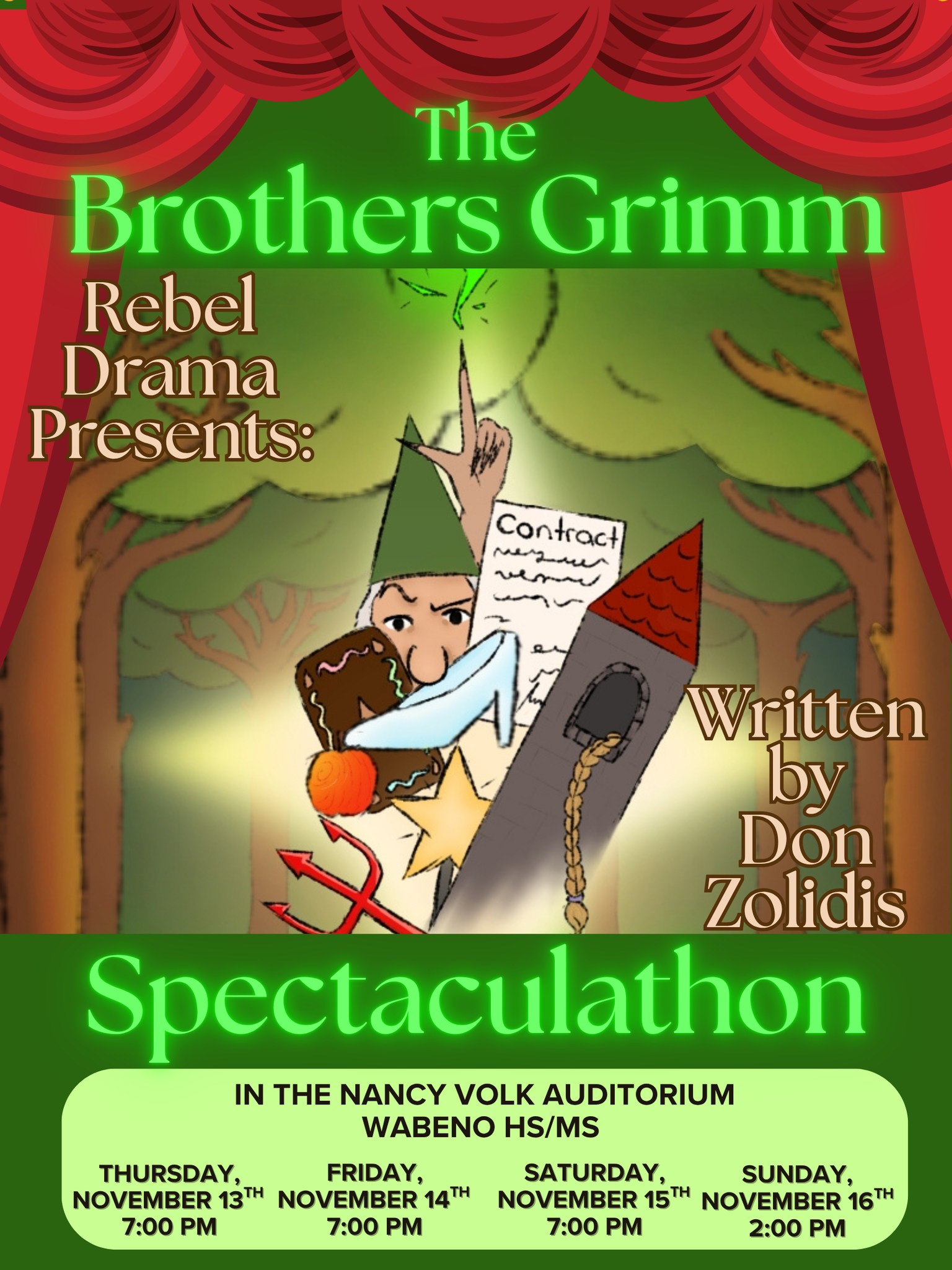 The Laona/Wabeno Rebel Drama Department presents “The Brothers Grimm Spectaculathon” by Don Zolidis from November 13-16 at the Nancy Volk Auditorium in Wabeno High School. First performed in 2007, this fast-paced comedy has appeared in thousands of schools and theaters worldwide.