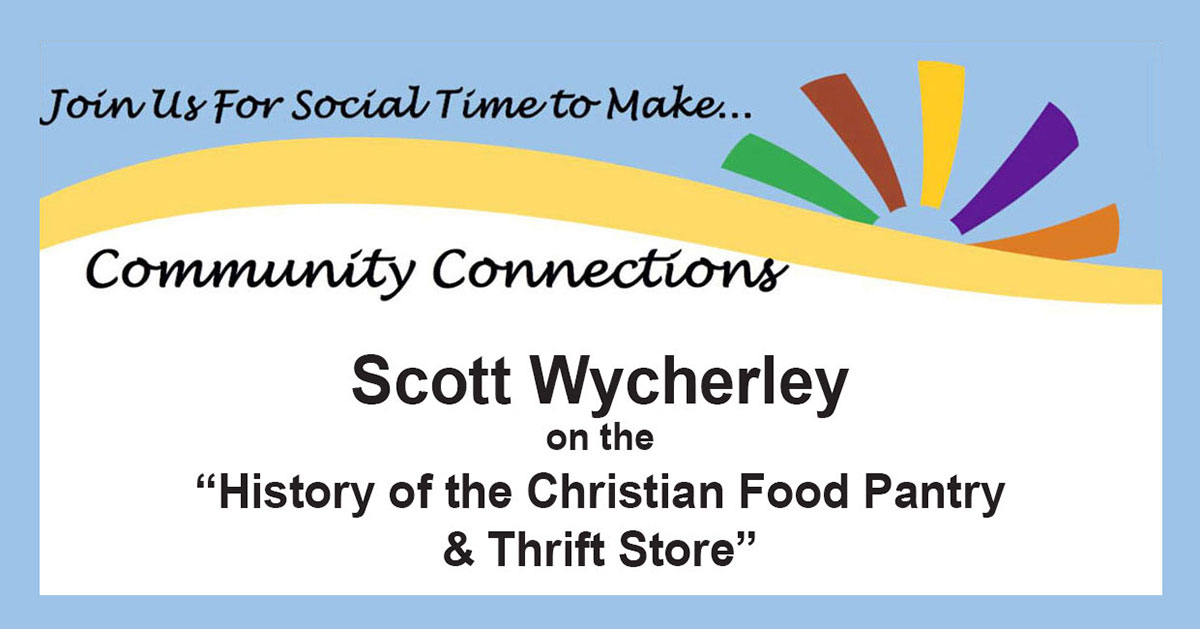 After social time, bring your lunch and stay for the Lunch N’ Program, which will run from 12:00 noon to 1:00 pm. The featured speaker, Scott Wycherley, will present on the history of the Christian Food Pantry and Thrift Store.