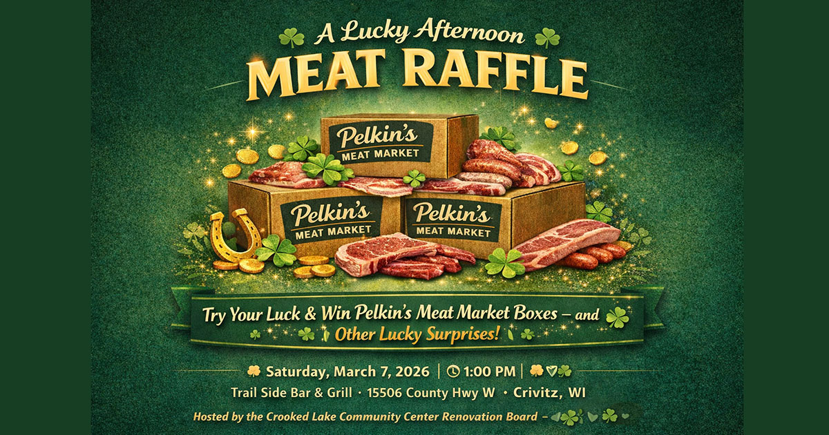 The Board of the Crooked Lake Community Center Renovation Project invites you to attend a Meat Raffle at Trail Side Bar & Grill, located at 15506 County Hwy W, Crivitz, beginning at 1:00 pm. This event will feature opportunities to win meat from Pelkin’s Meat Market, as well as prizes, all in support of fostering community engagement.