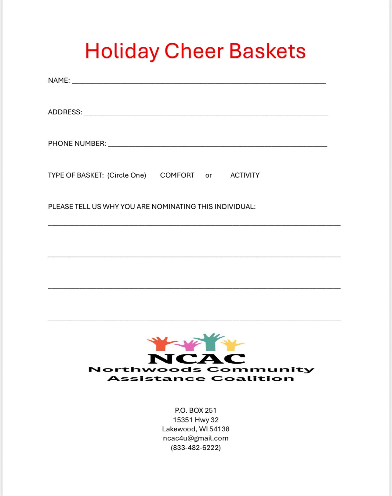 Northwoods Community Assistance Coalition is accepting nominations for cheer baskets, either comfort or activity based, to show recipients they are cared for. To nominate someone, please attach the Holiday Cheer Baskets form if possible and email Peggy Christianson at NCAC4u@gmail.com or mail NCAC, PO Box 251, Lakewood, WI 54138. Nominations close December 1, 2025.