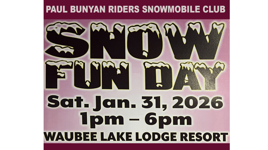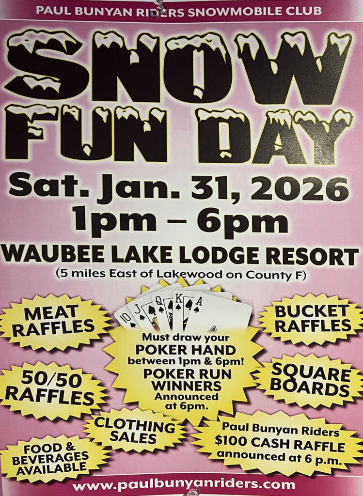 Paul Bunyan Riders Snowmobile Club’s Snow Fun Day is Saturday, January 31, 2026 from 1:00 – 6:00 pm at Waubee Lake Lodge. Meat raffles, 50/50 raffles, bucket raffles, square boards, food & beverage available, clothing sales & more! Waubee Lake Lodge is located at 18398 Waubee Park Ln in Lakewood. Follow this link for more information.