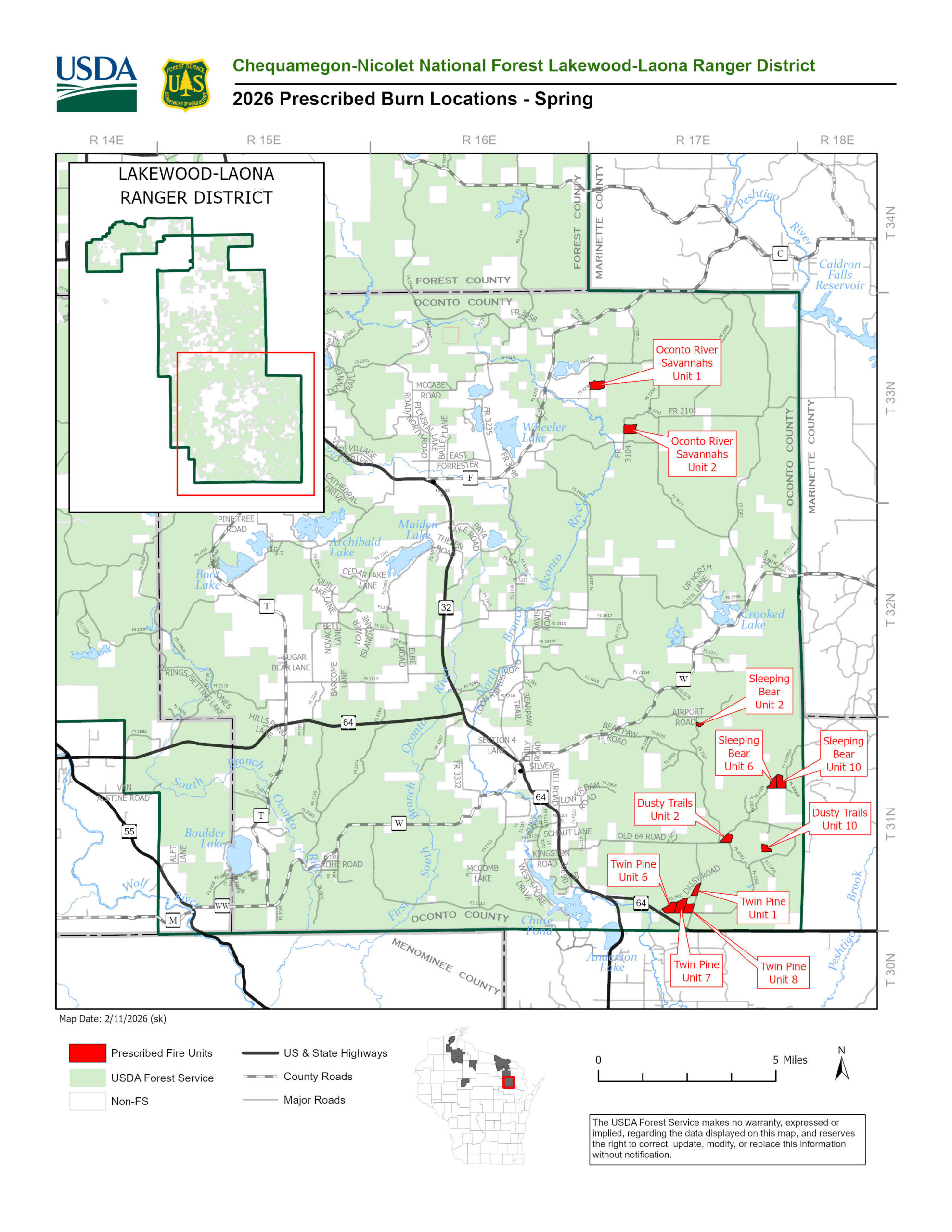 Visit the U.S. Forest website for additional maps and more information on prescribed fire plans within other areas of the Chequamegon-Nicolet National Forest at https://www.fs.usda.gov/r09/chequamegon-nicolet/fire/prescribed-burning-planned-spring-2026.
