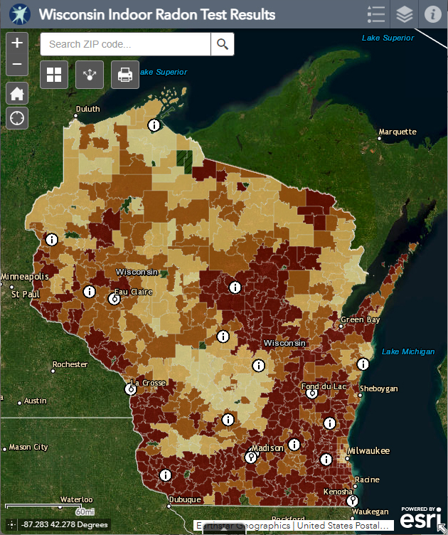 Follow this link to view radon test results in all of Wisconsin by zip code. See areas where homes and other buildings have tested high for radon. Note that this map is for informational purposes only and should not be used to determine the risk of indoor radon levels for any individual home or building. The risk of radon exposure and vary greatly between homes or buildings within very close proximity.