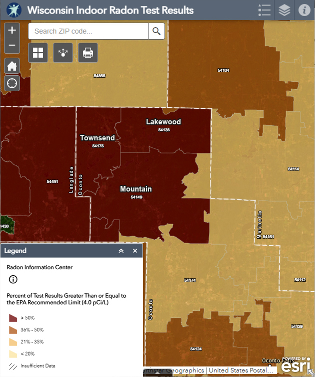 The only way to know your radon level is to test. The Wisconsin Radon Program recommends that every home and building be tested for radon to determine the risk of exposure and need for mitigation. In Oconto County, radon test kits are available for $5.00 for the month of January. Properties in Lakewood, Mountain, Townsend, Doty and Riverview have high levels of radon.