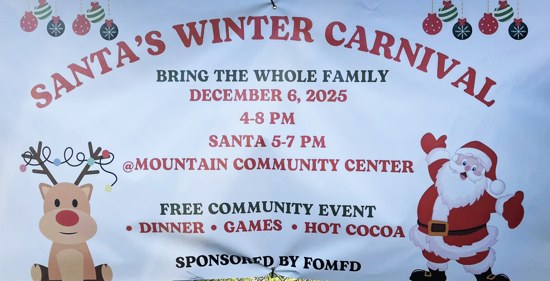 The Friends of Mountain Fire Department will be hosting Santa’s Winter Carnival on Saturday, December 6, 2025 from 4:00-8:00 p.m. at the Mountain Community Center located at 13412 Hwy 32 & 64. Bring the whole family to this free community event for dinner, games and hot cocoa.