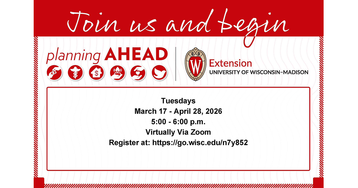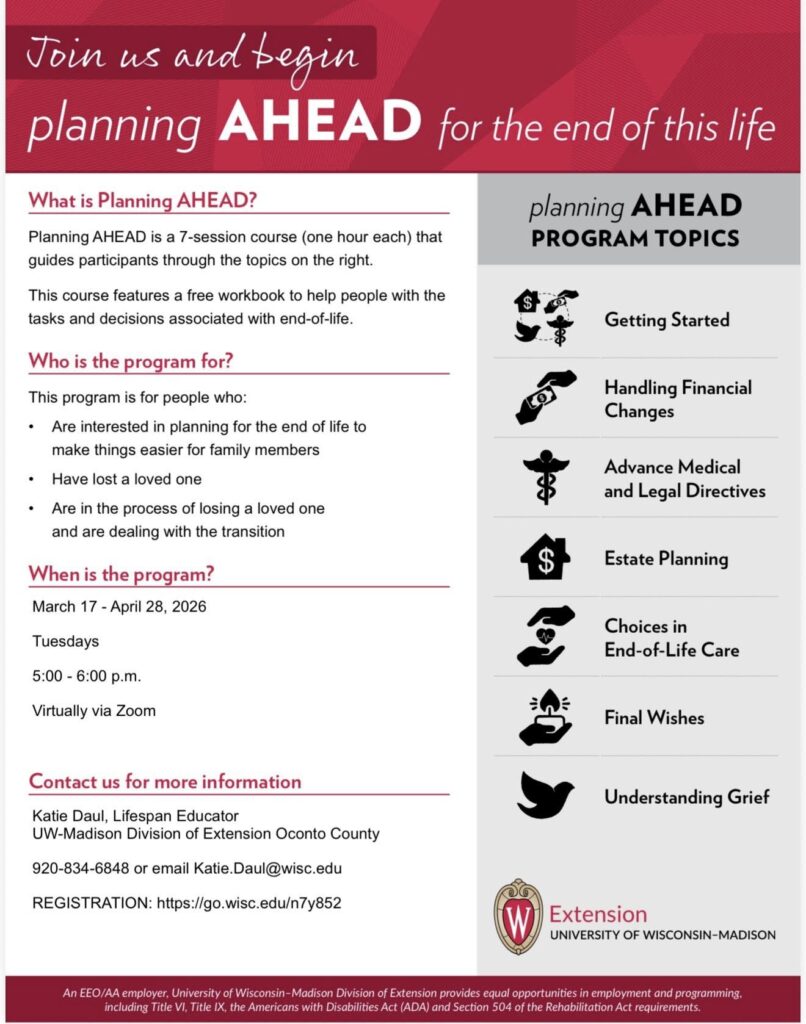 Katie Dahl, Lifespan Educator of UW-Madison Division of Extension Oconto County is hosting a seven session Planning AHEAD course beginning March 17, 2026. It will be held virtually on Zoom on seven consecutive Tuesdays starting at 5:00 pm and will be 1 hour in length with additional time for questions and is open to all.