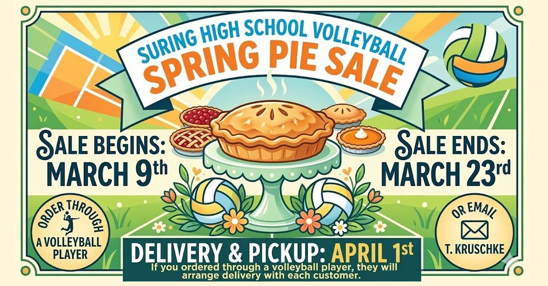 A member of the volleyball team may reach out to you soon with details on how to order. If you do not know a volleyball player but would like to purchase pies, please contact Tonia Kruschke by email at krusto@suringk12.org.