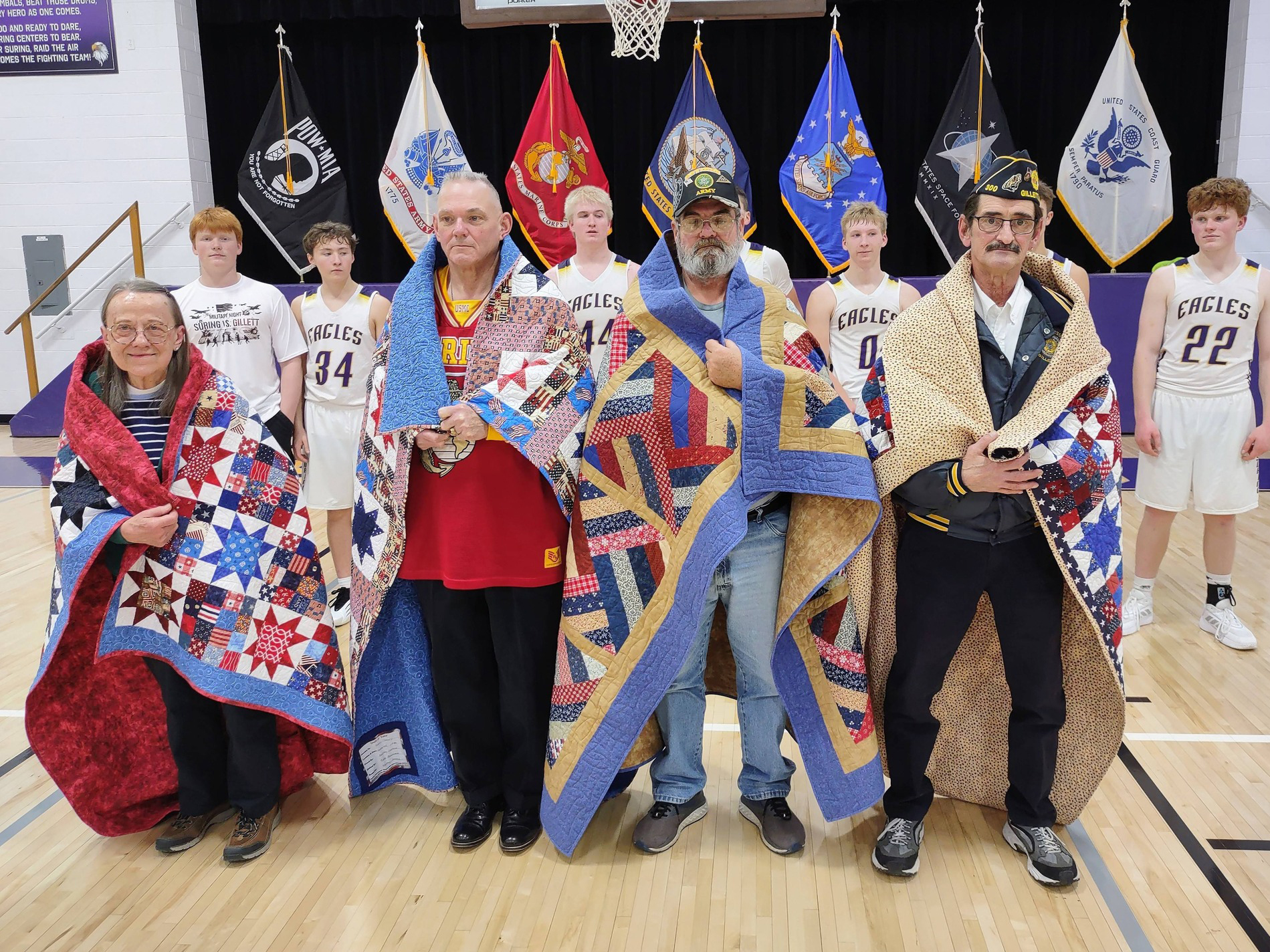 Vets 4 Vets of Northeast Wisconsin was proud to assist with the Suring Gillett Military Night spaghetti dinner on Friday, January 9, 2026 at Suring High School. After the boys varsity game basketball game, they awarded Quilts of Valor to the four Honored Veterans.