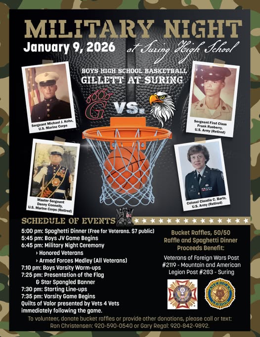 Vets 4 Vets of Northeast Wisconsin is honored to award Quilts of Valor to the Honored Oconto County Veterans after the boys varsity game at the upcoming Suring vs Gillett basketball game on Friday, January 9, 2026 at Suring High School. The evening’s events start with a free spaghetti dinner for veterans at 5:00 pm ($7.00 for the public). The Suring High School is located at 411 Algoma Street.