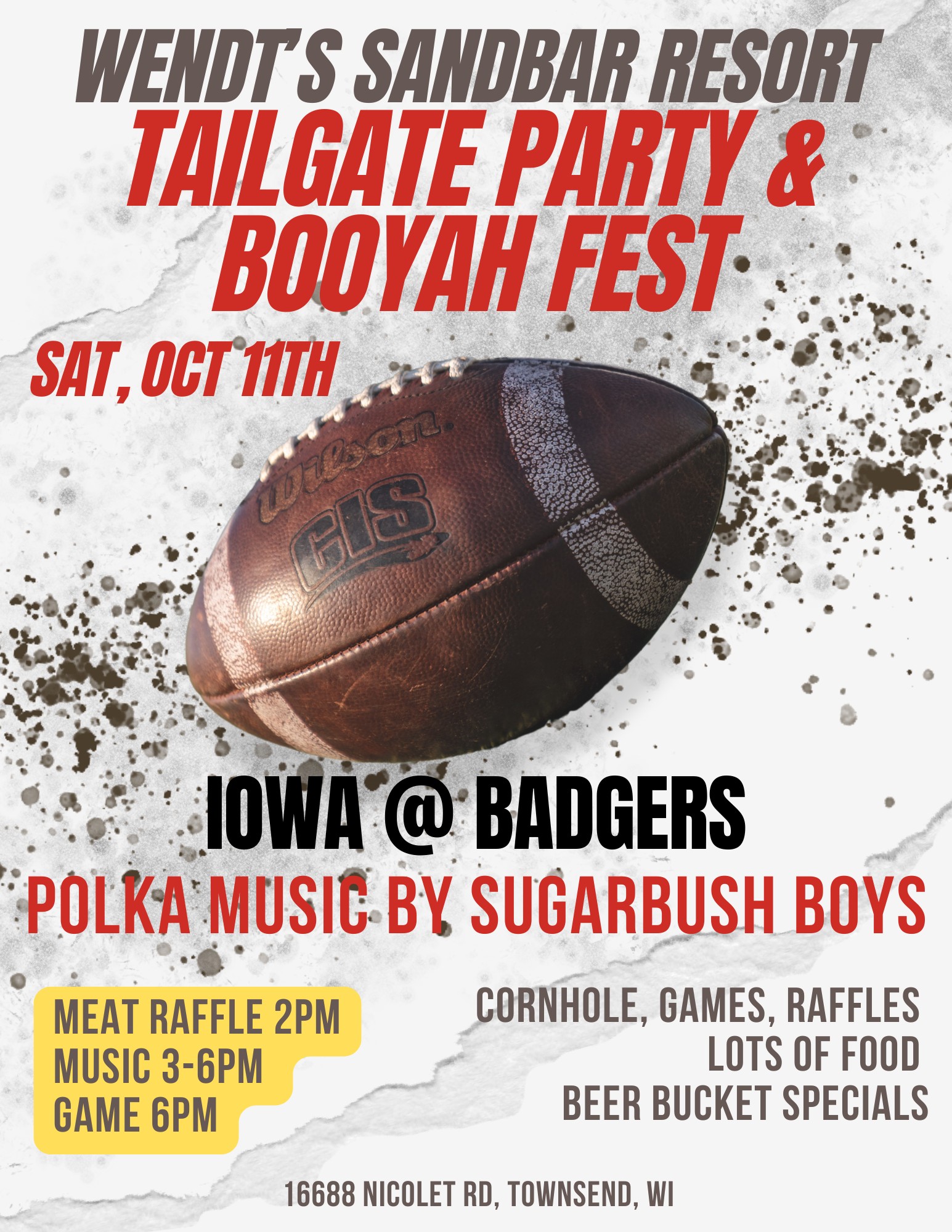 Wendt’s Sandbar Resort’s Tailgate Party & Booyah Fest will take place on Saturday, October 11. Enjoy cornhole, games, raffles, food and beer bucket specials. Meat raffle will be at 2:00 p.m. with polka music by the Sugarbush Boys from 3:00 to 6:00 p.m. with the WI Badgers game at 6:00 p.m. more details >>